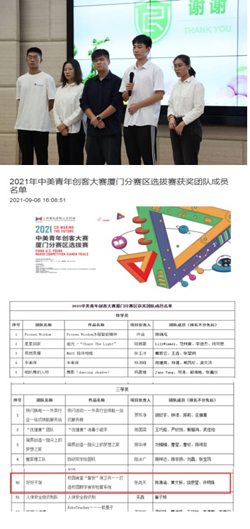 今日,由福建省教育厅主办,厦门大学承办的2021年中美青年创客大赛厦门分赛区选拔赛在厦门大学落下帷幕。经过48小时的“创客马拉松”现场比赛和评委们的作品评审及现场核查,beat365在线唯一官网“好好干饭”团队的项目《校园食堂“智安”保卫兵——打造校园数字食安检管系统》(成员:张尧天、饶思莹、陈漪涵、黄文标、许明烽,指导老师:李文清)荣获三等奖。
