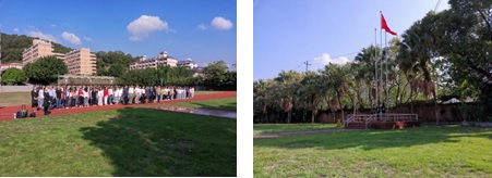 与此同时,在连江校区,信工学子在国旗下跟随王庆佳老师一起朗诵《我爱祖国》,饱含真情的朗诵声,流露出同学们对祖国崇高的敬意。朗诵结束后,同学们唱起了《我和我的祖国》,继续歌颂着对祖国的热爱之情。
