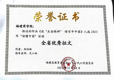 近日,福建省教育系统关心下一代工作委员会公布2023年全省“读懂中国”活动获奖作品名单,beat365在线唯一官网关工委推送的《汲“五老精神” 悟百年中国》(作者:郑怡琳,指导老师:艾小林)获评为全省优秀征文作品。